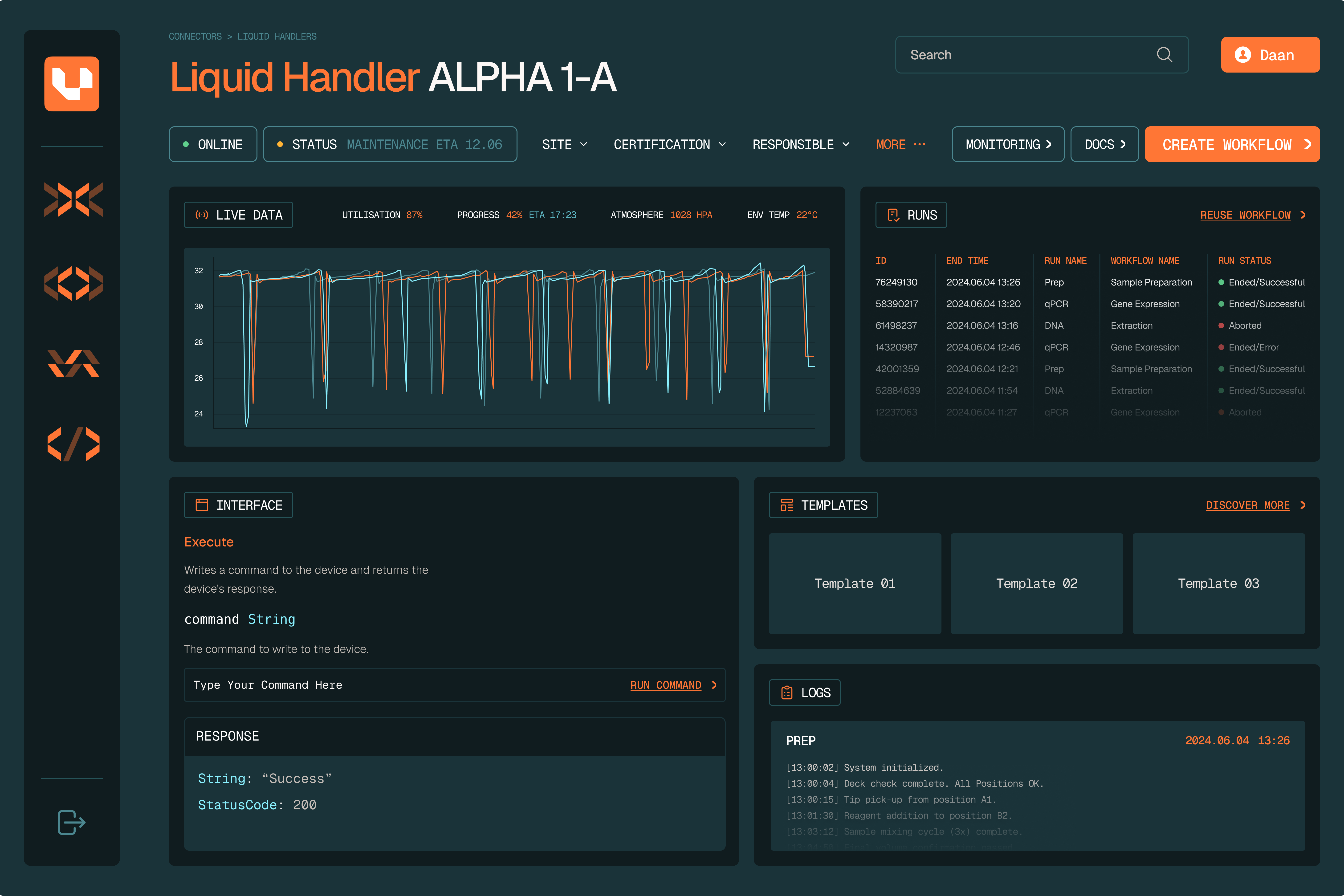 UniteLabs simplifies the complex. Supporting large fleets of instruments across all vendors with ease. From low-level pipetting instructions to full workflows, orchestrate every system through code, not clicks.
