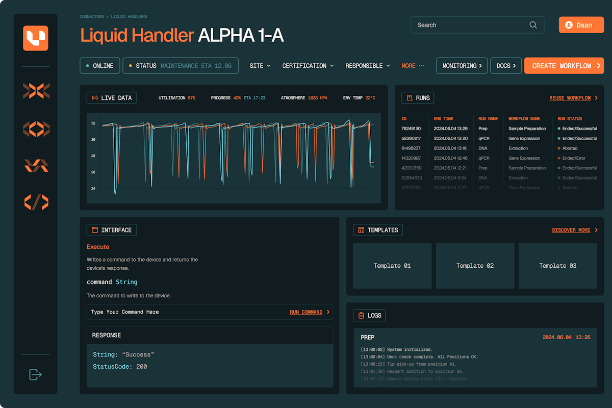 UniteLabs simplifies the complex. Supporting large fleets of instruments across all vendors with ease. From low-level pipetting instructions to full workflows, orchestrate every system through code, not clicks.